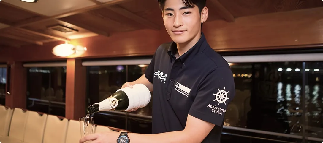 マグロの解体ショー、樽酒鏡開き、マジックショー、ベリーダンスなど、記念日を盛り上げるエンターテイメントをご用意しています。また、バルーンや卓上装花などの華やかな装飾、ウェディングケーキ、リムジン送迎、シャンパンフリーフローなど、こだわり抜いたオプションで特別なクルージングを実現します。