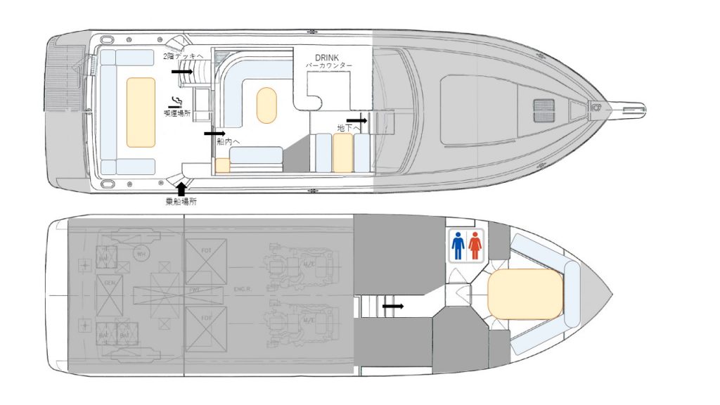 船内の基本レイアウトはこちらになります。メインフロアと後方デッキを合わせ、一体感のあるパーティーが可能です。