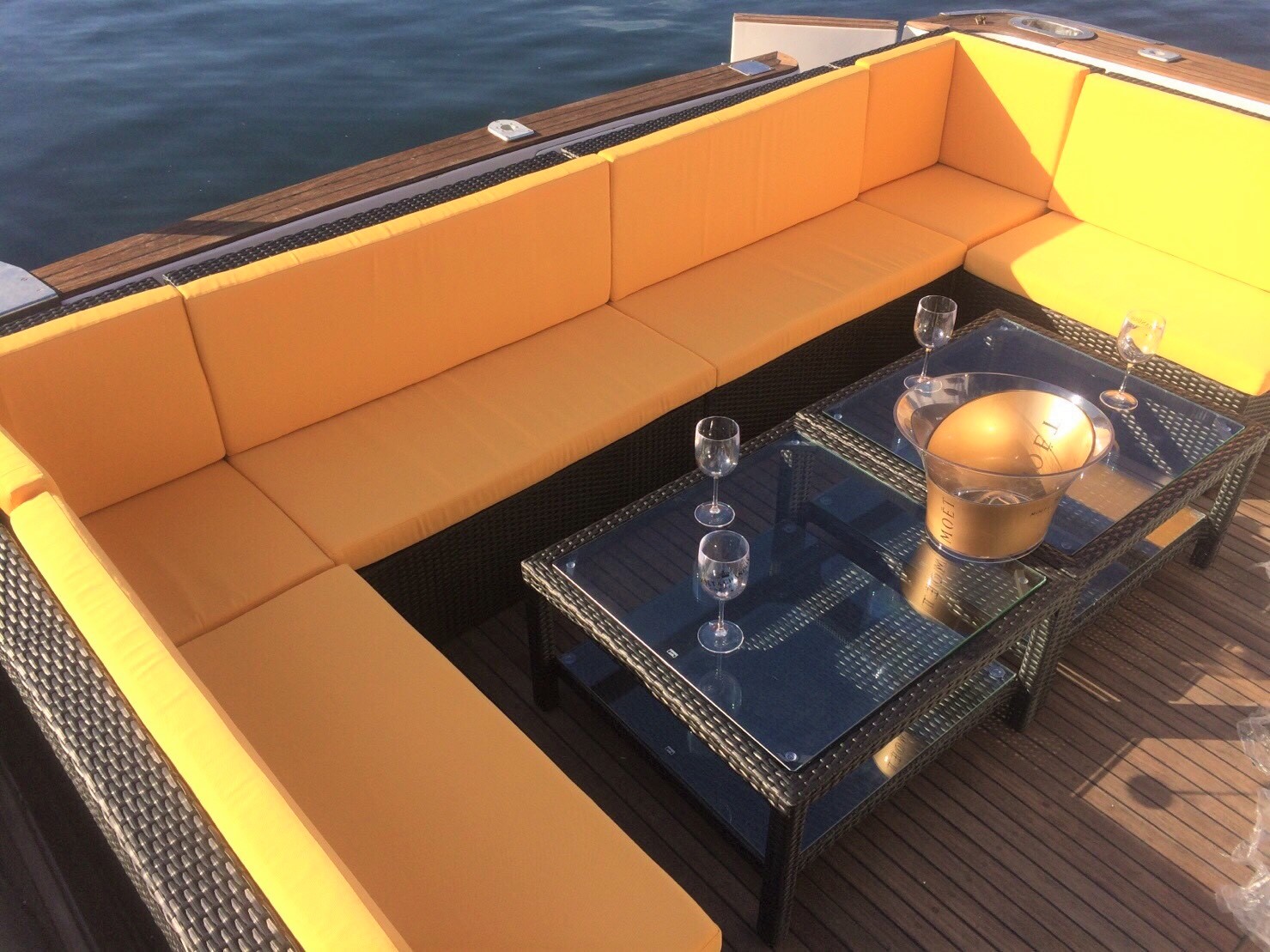 後方デッキには、最大10名様ご着席いただけるリゾート感・非日常感のあるソファーが設置されています。
