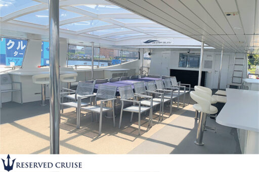 2012年9月就航の最新鋭クルーザー。2階部分は開放感あふれるオープンスペースがあり、ジャグジーも完備しています。船名オセアンブルーはモナコの青い海をイメージして付けられ、地中海クルーズを彷彿とさせます。通常プライベート感のあるメガヨットをパーティーシーンに適した構造に設計し、最大96名が1フロアで集えるこの上ない空間が洋上を颯爽と巡ります。東京湾NO.1ラグジュアリーといっても過言ではありません。