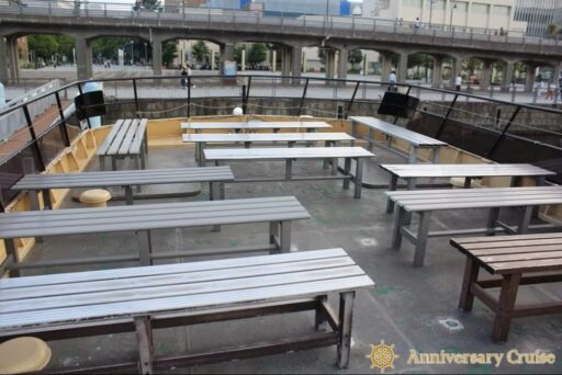 広々とした船内スペースには40名様程がご着席頂けます。レイアウトの変更は出来ませんが、あらゆるパーティーに対応可能な汎用性の高いレイアウトになっています。