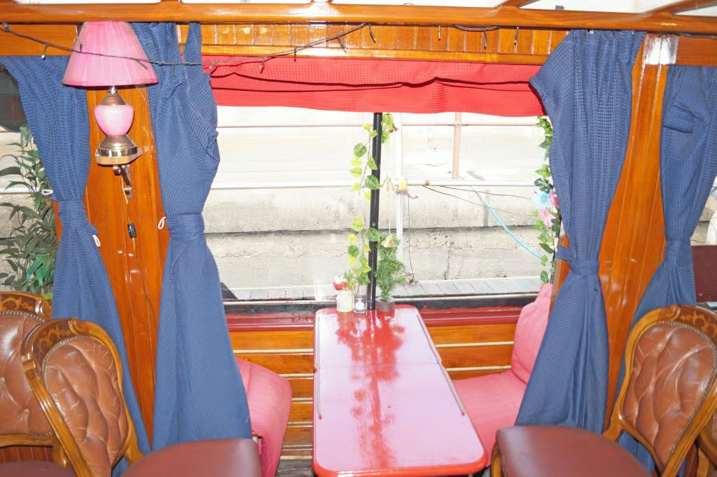 明るい木目調に統一され、絨毯が敷かれた重厚感の落ち着いた雰囲気のクルーザーです。重厚感のある船内で、ビュッフェを楽しむもよし、開放的な後方スペースでゆったり景色を一望するのもよし。船長のこだわり溢れるユニーク船で特別なひと時をお過ごしください。