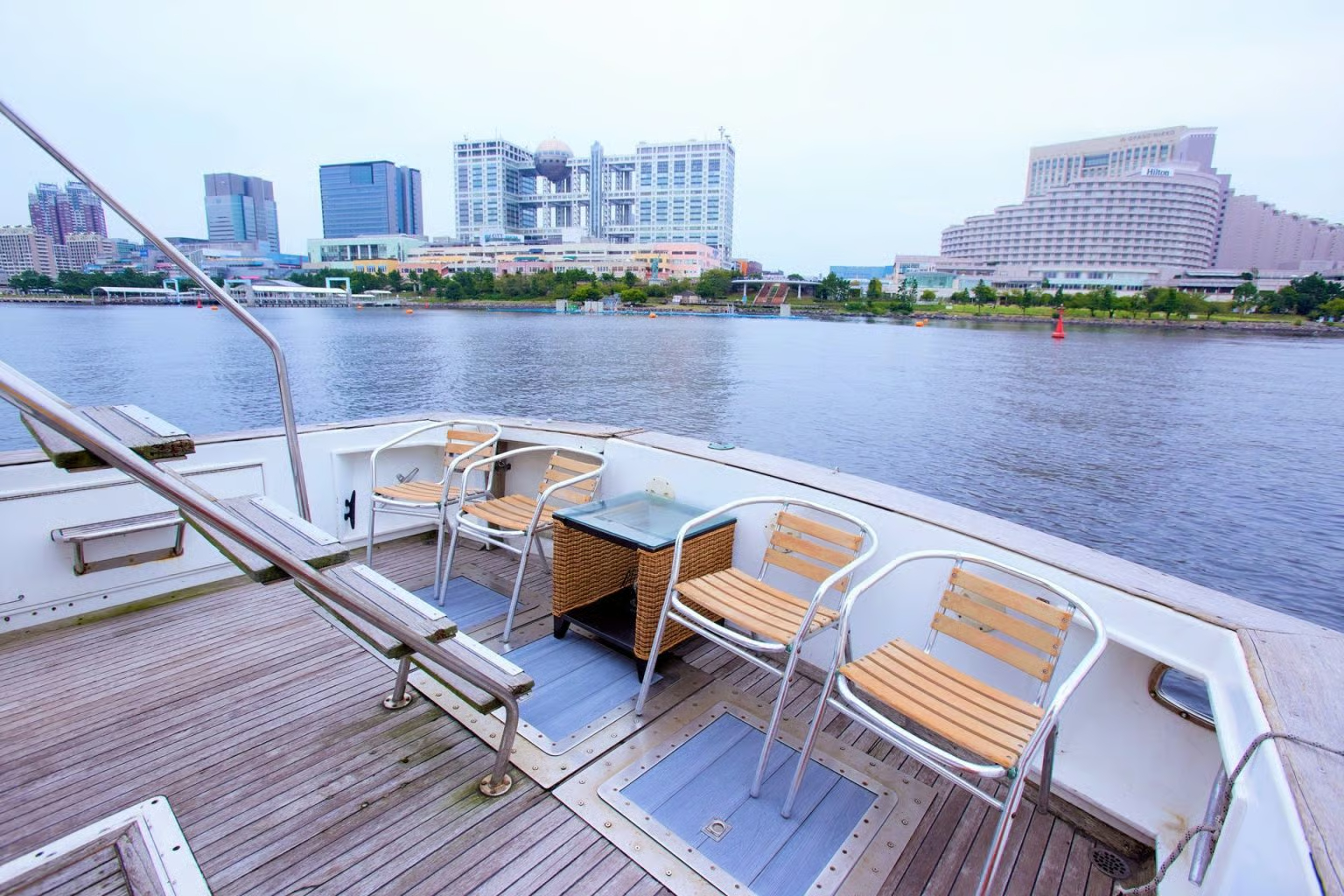 ウッドデッキが魅力的な後方デッキにはリゾートチェアをご用意しております。東京湾の絶景を楽しみながらの乾杯をどうぞ!