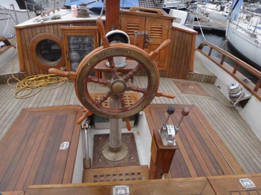 誰もが憧れる舵輪が甲板後部に備え付けられています。写真奥の扉を開いて船室へと降りることが出来ます。