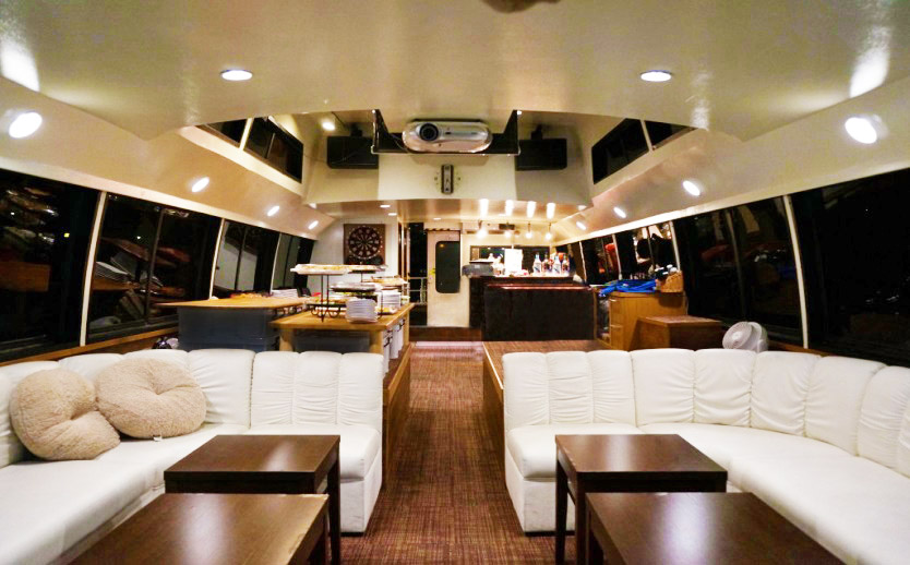 音響映像設備充実の遊び場ラウンジ風の船内は小規模クラブな雰囲気!ソファースペース、バースペースと別れ、立食で交流を楽しみたいパーティーにオススメ!