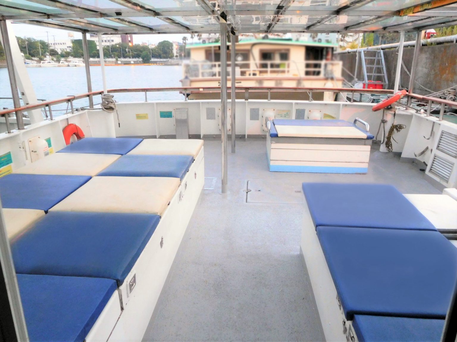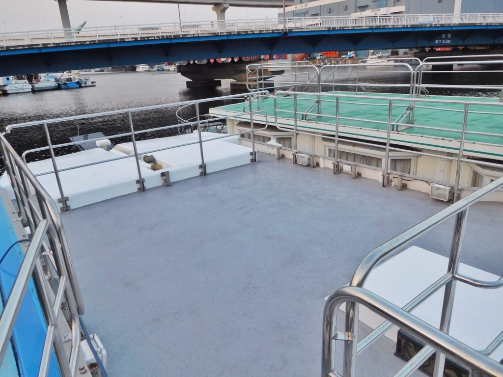 船内から繋がる後方デッキは広々とした半オープンスペースになっています。東京湾の風と景色をお楽しみください。