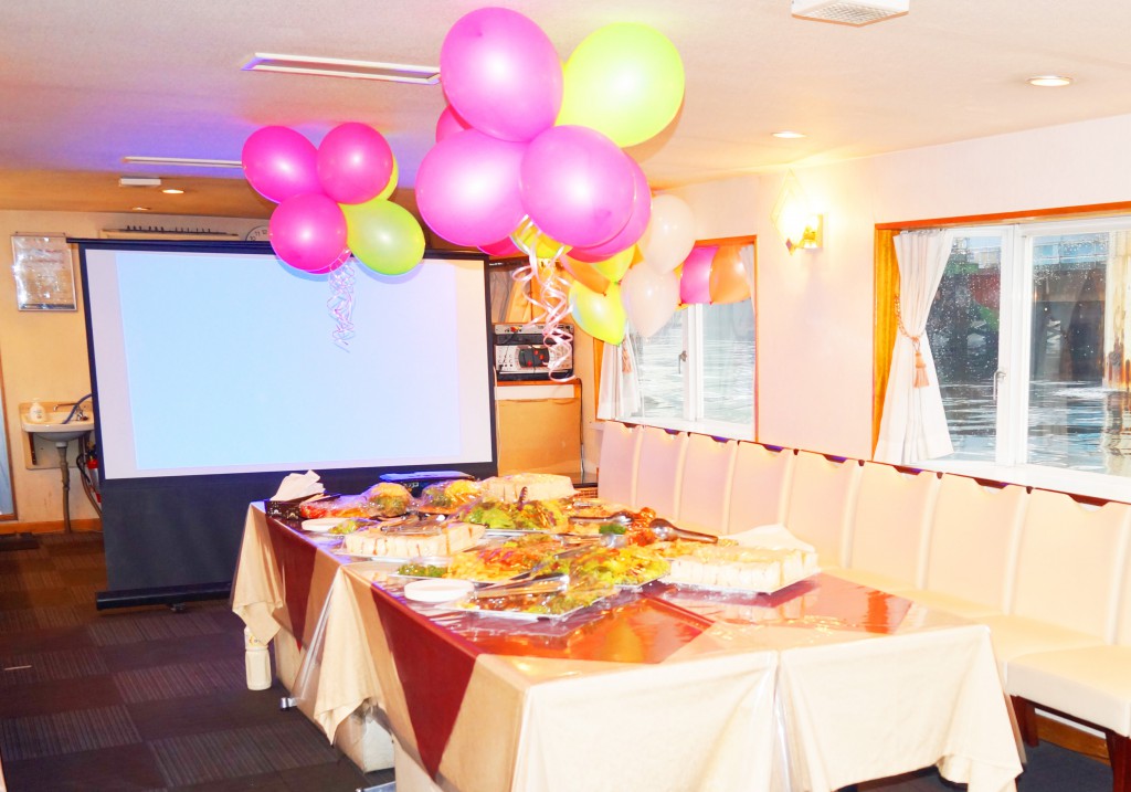 テーブルクロスやお花の装飾を追加すれば、婚礼二次会にも最適な船舶です。