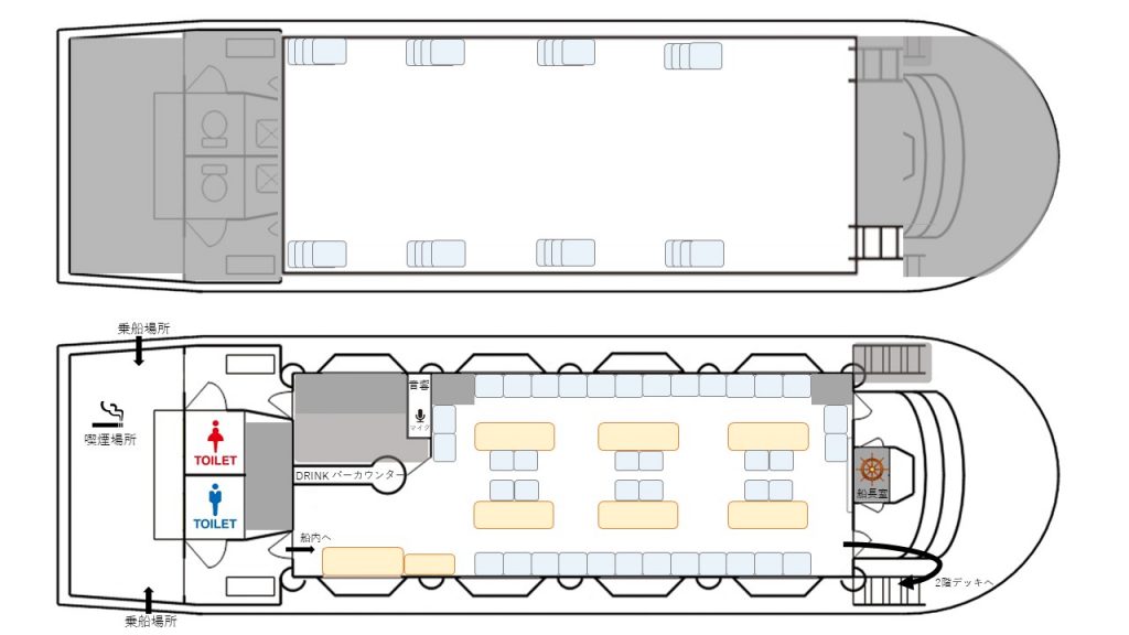 オリエンタルの船内基本レイアウトはこの形。広い船内には最大40名様までご着席いただけます。