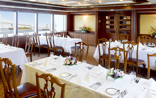 グッドデザイン賞を受賞した優雅な外見と豪華な船内が魅力のレストランシップです。都心部からのアクセスに優れる日の出エリアからの出航ですので、企業行事や婚礼など幅広い目的でご利用いただけます。