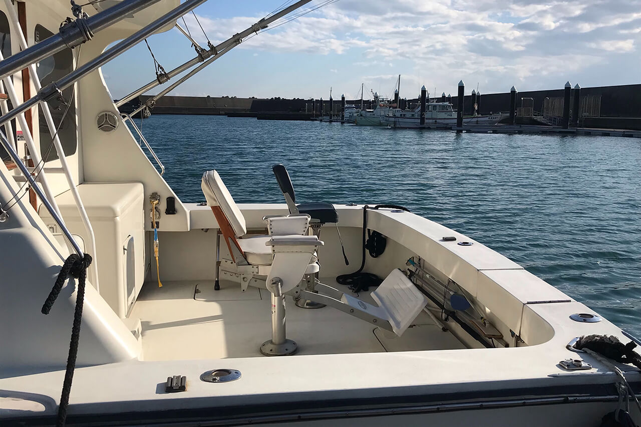 広々とした後方デッキにはフィッシングチェアーが設置されています。BBQクルーズの際には、こちらにグリルを設置します。