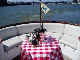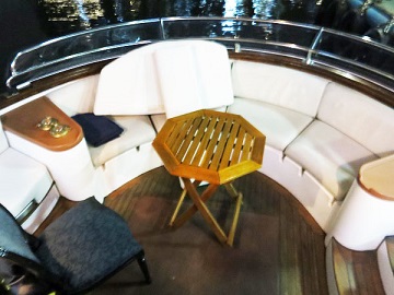 後方デッキにはオシャレなテーブルクロスやワインが良く似合います。東京湾の風と日差しを堪能しながら、快適な時間を過ごして頂けます。