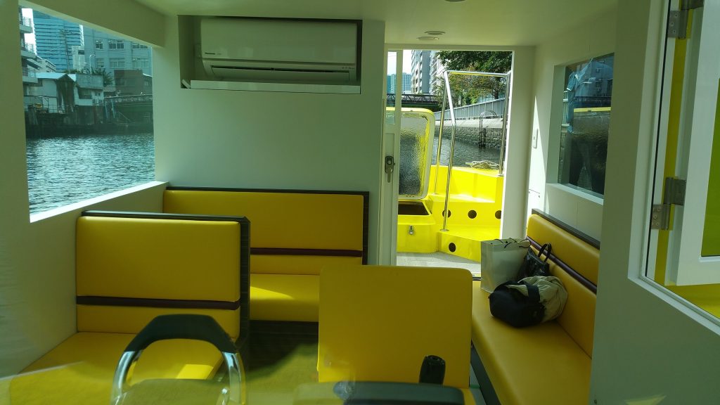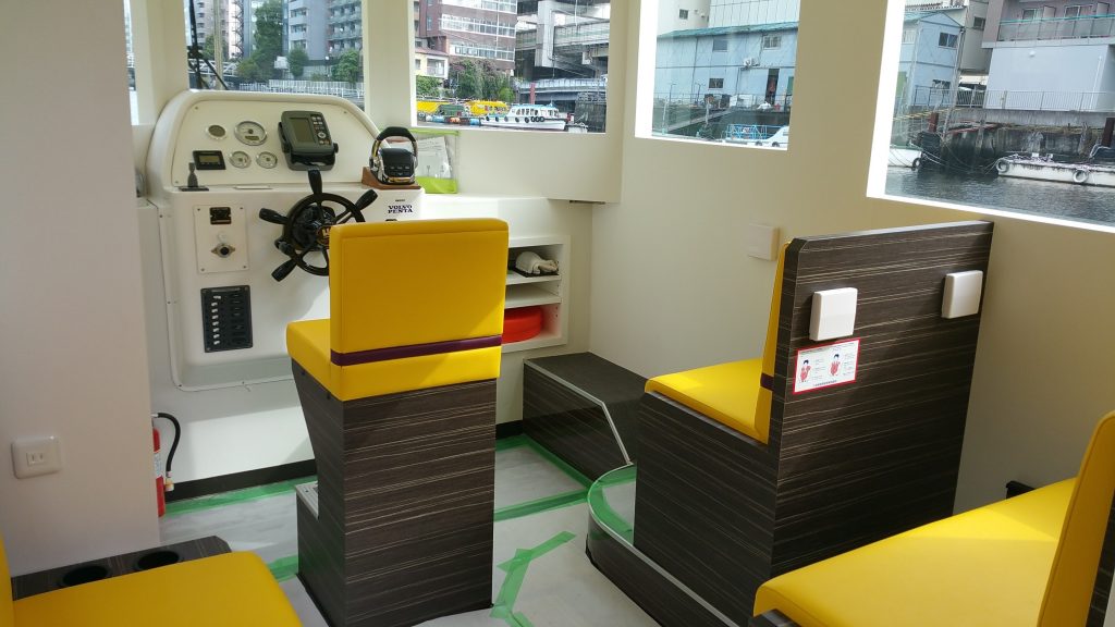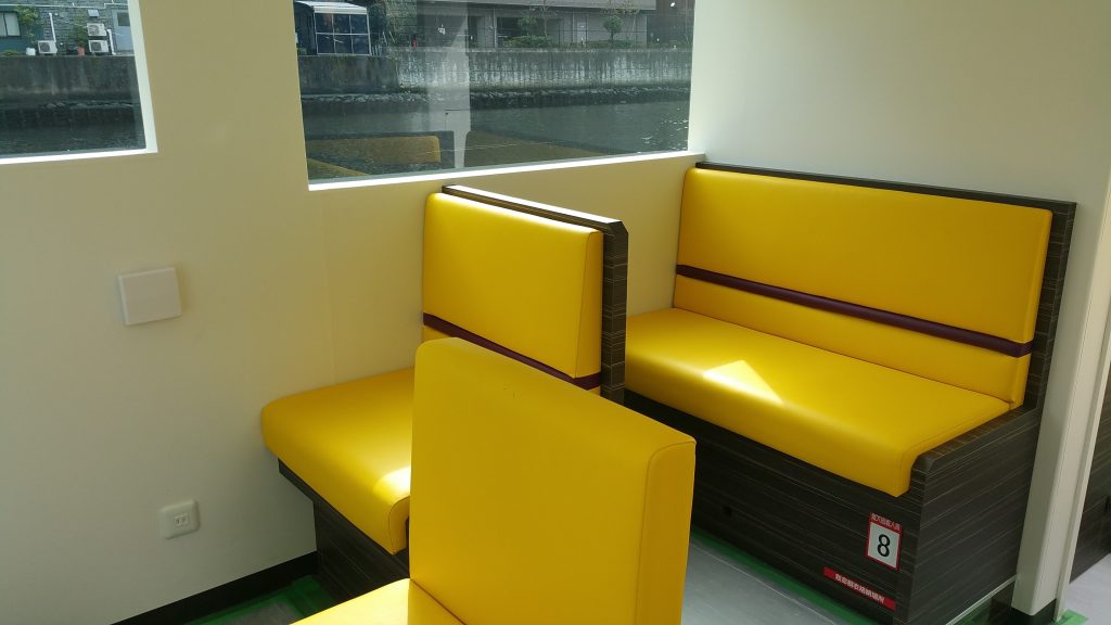 船内は清潔感のある内装でまとめられ、黄色のソファーがトレードマークです。