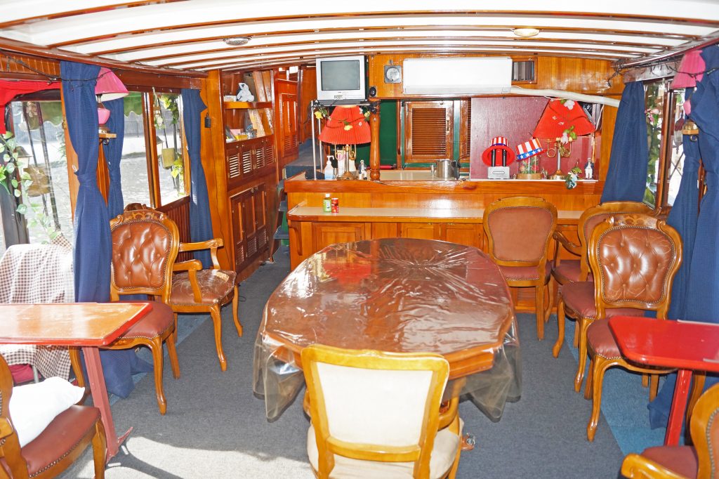 明るい木目調に統一され、絨毯が敷かれた重厚感の落ち着いた雰囲気のクルーザーです。重厚感のある船内で、ビュッフェを楽しむもよし、開放的な後方スペースでゆったり景色を一望するのもよし。船長のこだわり溢れるユニーク船で特別なひと時をお過ごしください。