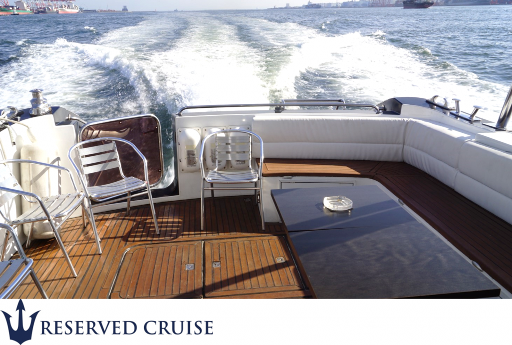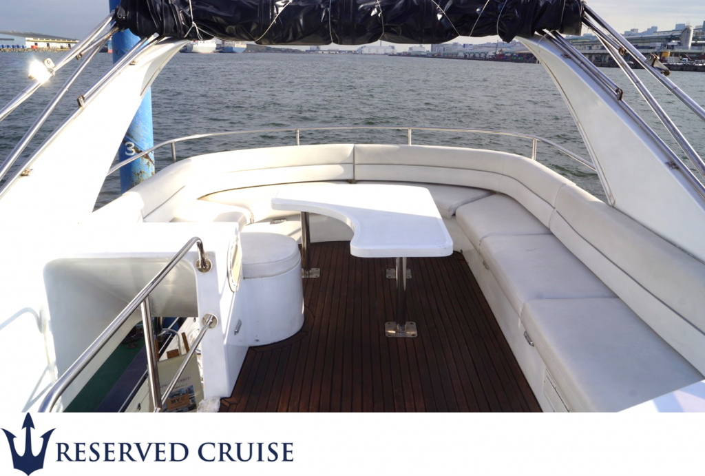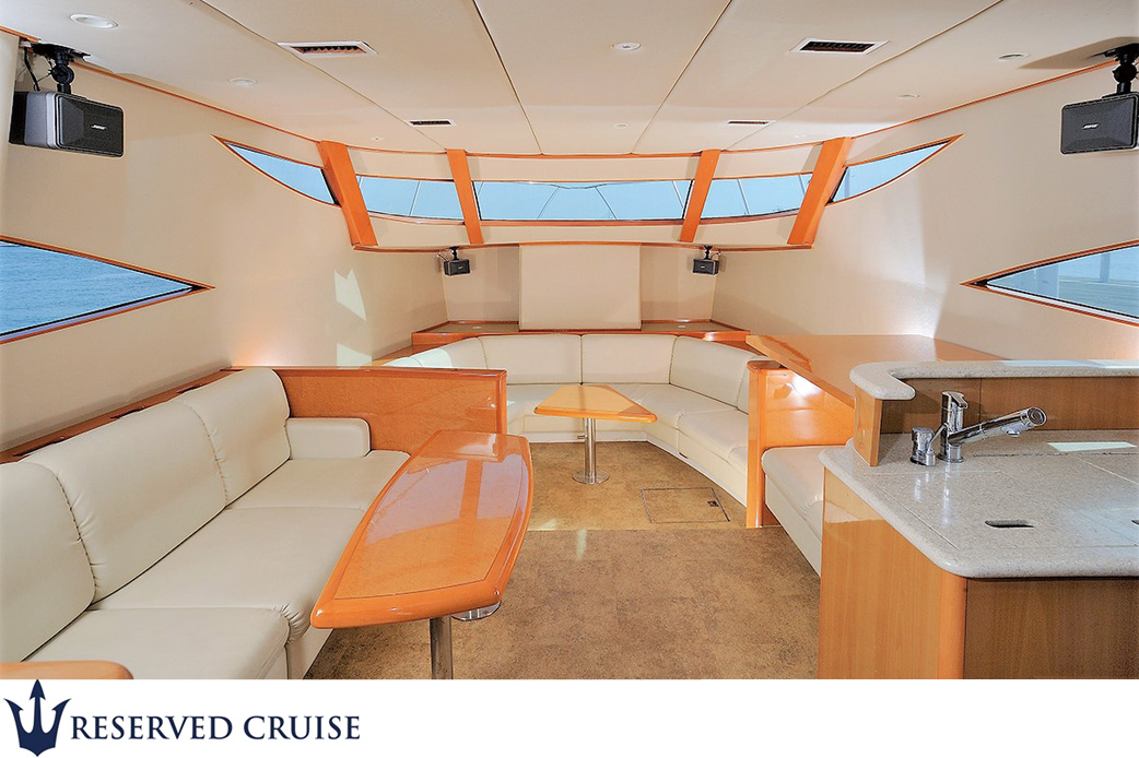清潔感のある客室内と広々としたアフトデッキ・スカイブリッジが特徴。海水浴クルージングでも人気のクルーザーです。