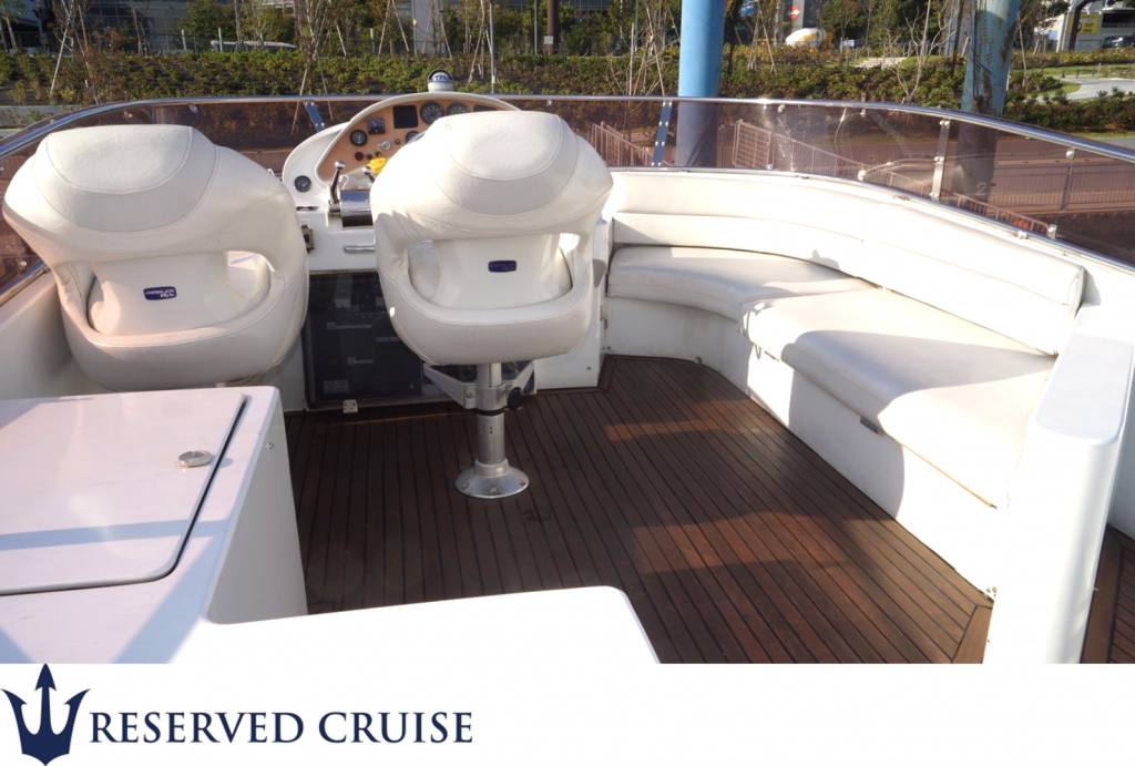 2階デッキには操船スペースが有り、その横にもお座りいただけます。船長気分を味わったり、船長からのクルージング名所説明もお聞きいただけます。