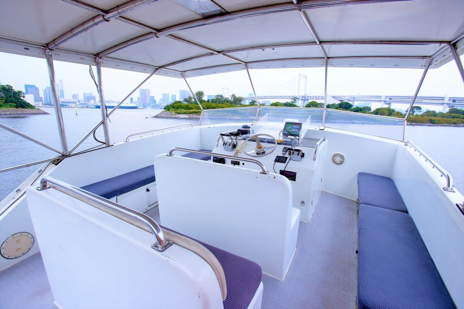 2階デッキは船長の操船席になっています。その外周にはソファーが設置されていますので、解放感溢れる景色をお楽しみいただけます。