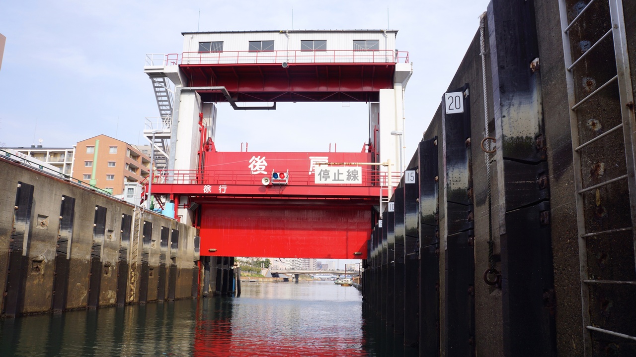 見どころとしては、まずひとつに小名木川の新扇橋と小松橋の間にある扇橋閘門があげられます。この水門は、パナマ運河と同様の仕組みで、高低差約2メートルの東西の水位を調節するため、水門が昇降する造りが採用されている特殊な水門です。このことから、「東京のパナマ運河」とも呼ばれており、クルージングではその水門をじっくりと見学できます。