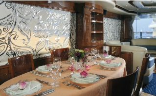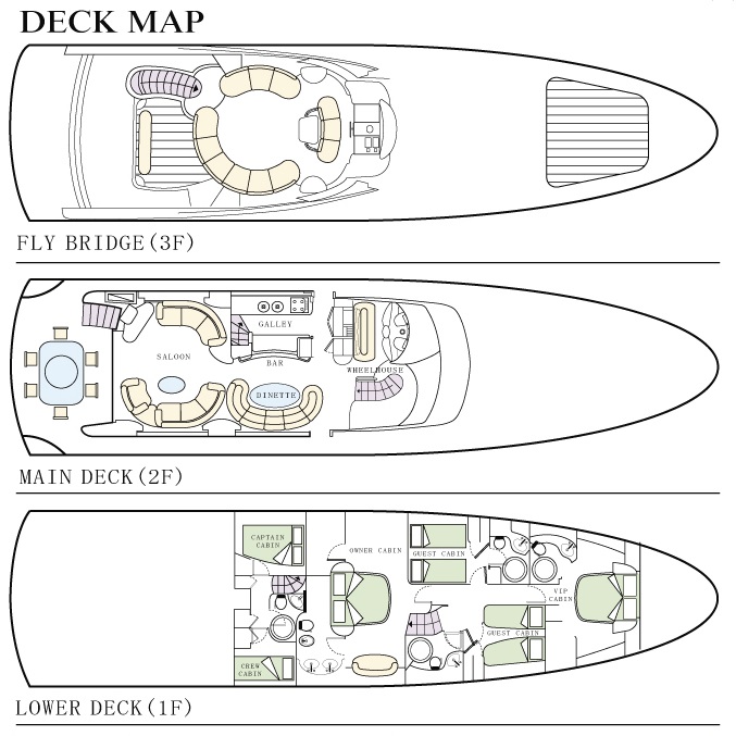 The cruiser's layout is illustrated above. Enjoy a truly luxurious experience in the gorgeous three-level interior.