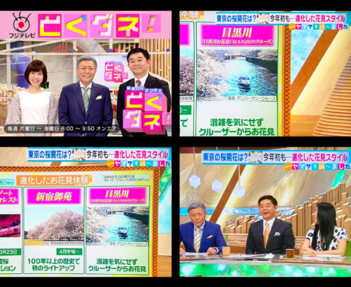 フジテレビ系列で平日朝に生放送されている人気ワイドショー情報番組、通称『とくダネ!』。人気コーナー「Newsヤマサキ調べました」にて弊社の春のお花見企画【お花見CHANDONクルーズ】が“進化したお花見スタイル”として特集されました。