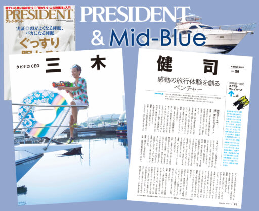 人気ビジネス総合誌『プレジデント』(8/23発売)。人気コーナー「田原総一朗のネクストブレイカーズ」に弊社代表のご友人、三木健司氏が登場し、弊社Mid-blue号船上での撮影写真が掲載されました。