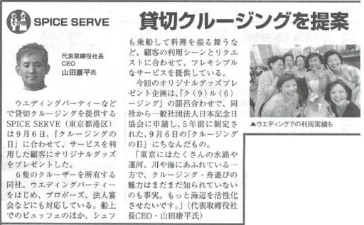 ブライダル業界唯一のビジネス専門紙「ブライダル産業新聞」(9月21日号)。アニバーサリークルーズが制定する9月6日「クルージングの日」について、掲載されました。