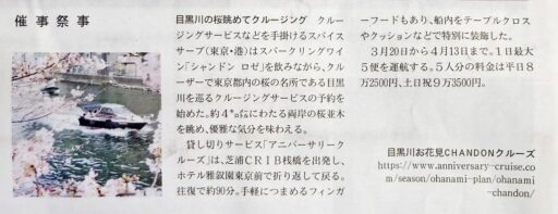 2月16日の日経新聞で「目黒川お花見CHANDONクルーズ」について取り上げていただきました。