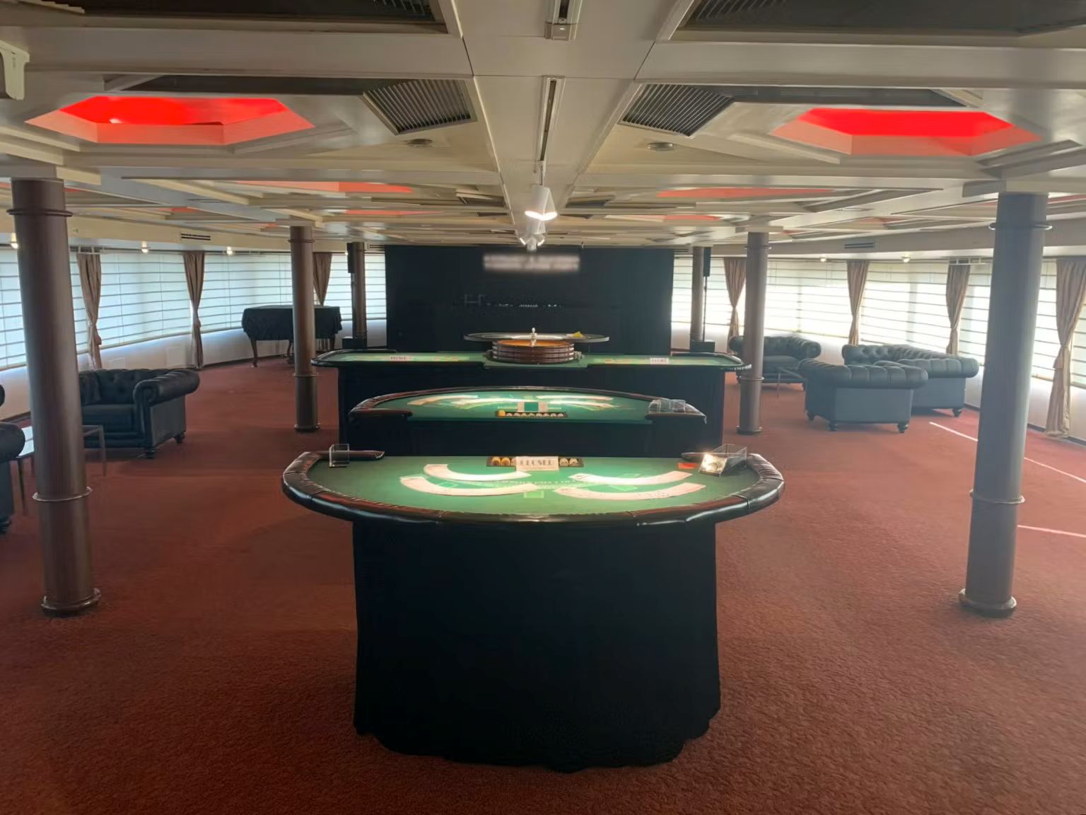 各ゲームは小さな台で1.8m×1.1m、大きな台(ルーレットダブルなど)では4.1m×1.5mほどの盤面に、周りをディーラーとプレイヤーが取り囲むような形になりますので「乗船人数+機材の広さ」を確保できる、大きめの船舶をご提案させていただきます。