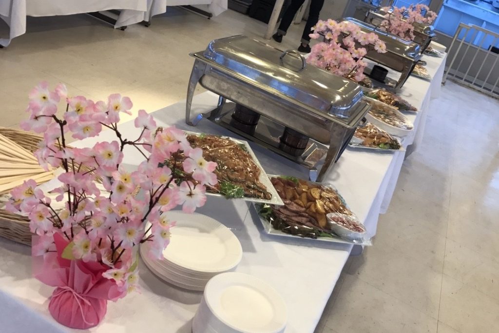 船内のフロアやビュッフェ台の上を、桜の木の造花で装飾します。