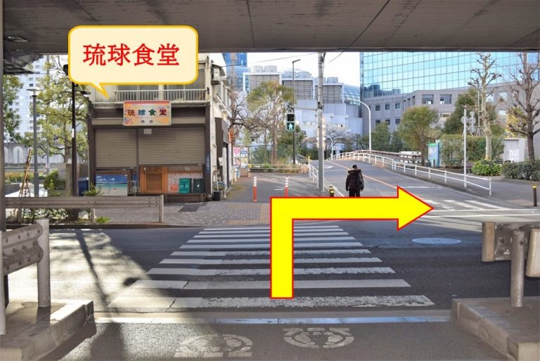 正面に「琉球食堂」が見えたら、右へ渡ります。